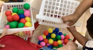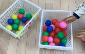 HOME > スタッフブログ > わくわくタイム♪ ボール拾いゲーム 2025/10/20 わくわくタイムで、ボール拾いゲームをしました! 音楽の流れている間はボールを拾ってカゴに入れる、音楽が止まったら動きを止めるルールです。 ボールを拾うのに夢中にになる姿もありましたが、だんだんと音楽を聴く意識ができ音楽が止まると動きをピッタと止めることができています。 かごたくさん集めることができ楽しそうです😊 Twitter Share Pocket LINE コピーする