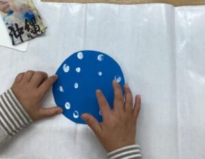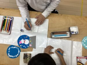 小学生は雪だるまを描いて作っています。イメージし雪だるま以外にも飾りたいものがあれば作ってよいことを伝えると。好きなキャラクターやうさぎの雪だるま、サンタさんなど工夫して作っています。
