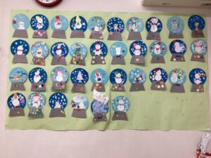 雪だるまに顔を描いたり飾りをつけてスノードームの中を飾りました。