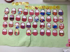 だるまの飾りは紙をちぎったり切ったりして貼っています。